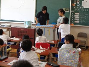 1年生教室をのぞきました。算数で、水の量を比べていました。