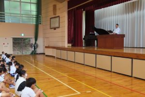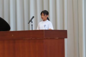 2枚めの写真は児童代表のお話。今学期頑張りたいことを発表しています。