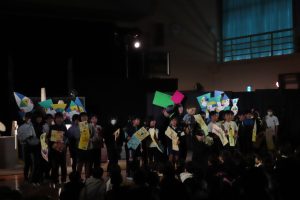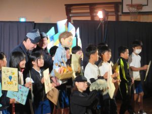 ワークショップとして、4年生が事前に人形を作り、セリフを練習しました。