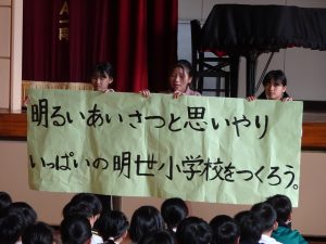 「明るいあいさつと思いやりいっぱいの明世小学校をつくろう」という目標。