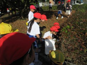 化石公園では、秋見つけをしました。きれいな葉っぱやどんぐりを見つけました。