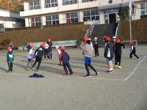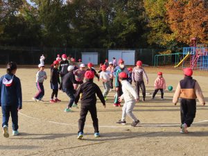 「田んぼのた」や「ころがしドッチ」など、1年生の子も安心して遊べる運動を、グループごとに行います。高学年はリードすることや思いやりを大切にしています。