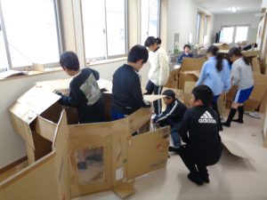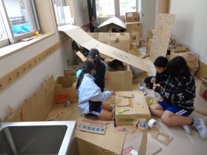 4年生が図工の学習で「ゆめのまち」を作りました。ダンボールを切って、つないで、家やお店を作っていく学習です。