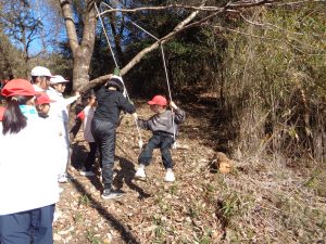 学習の後は、5年生がつくったブランコやターザンロープで遊びました。
