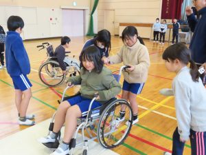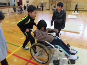 写真は、車椅子を押す様子です。やさしい声をかけていました。